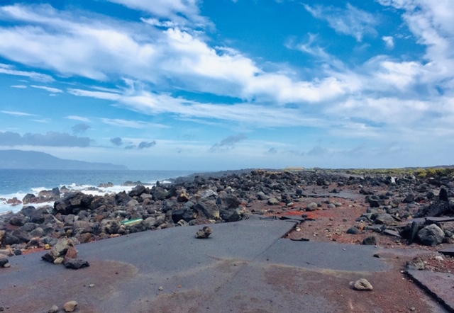 We were walking on, what up until two days ago, had been considered one of the most scenic coastal roads in the world. It connects (or use to) the eastern side of the island with the western side. And now, its asphalt had been ripped up and flung around like a piece of flimsy cardboard having landed far away.